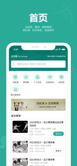 击剑圈手机版是一款提供击剑比赛运动的应用平台,集运动员、裁判、教练查询、俱乐部、积分排名、击剑百科等功能服务为一体,随时在线了解更多击剑知识,参与赛事报名,寻找剑馆,提供训练课程学习,致力于推广击剑运动,使用方便!
