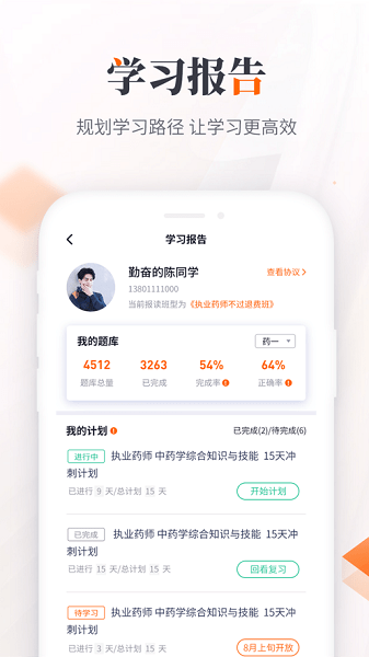 3.学习报告:全方位检测学习情况,计划完整量及题库完成数据