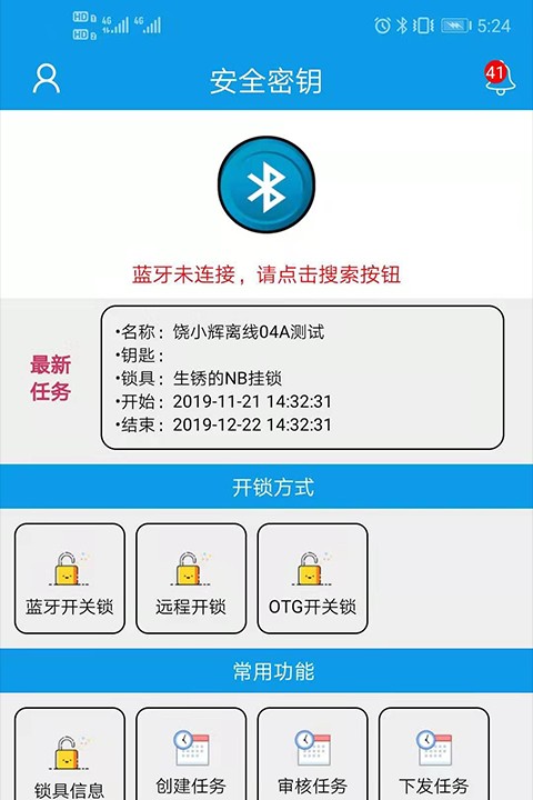有许多安全密钥功能,其中有锁具信息、创建任务以及审核任务等多种常见功能;