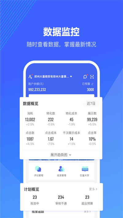 随时随地都能调整预算、出价、用户定向等投放关键设置,再也不用随身携带电脑啦;