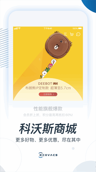 科沃斯机器人官方版即ECOVACS HOME,是科斯沃机器人旗下官方智能机器人应用软件,适配多款智能产品设备连接使用,提供多种模式选择,还可以可视化地图查看,远程操控机器人,了解其运行状态,各种会员优惠福利尽享不停,轻松购物!