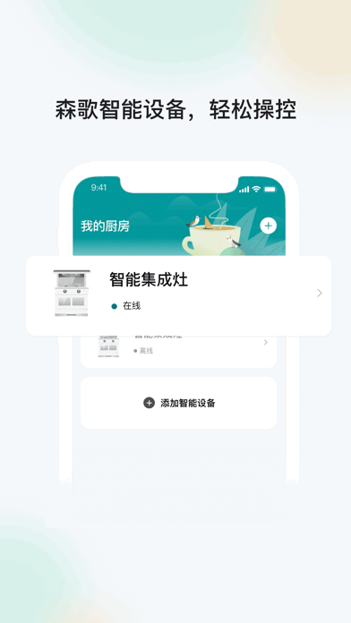 省心、省电、随时随地轻松遥控森歌智能厨房电器,餐前餐后轻松搞定。