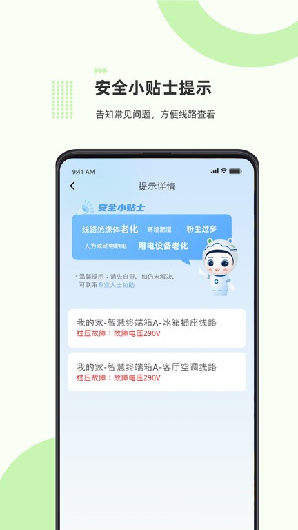 故障提示:全方位监测线路状况,及时主动推送线路预警和线路故障信息,极大的提升家庭的用电安全。