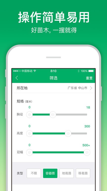 提供筛选苗木的功能,支持直接根据所在地以及规格等进行筛选查看苗木;