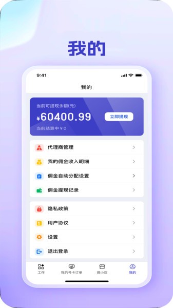 在“我的”管理界面中,我们将为您打造个性化的管理体验。您不仅可以进行代理商管理,包括代理商的招募、审核、培训、考核等各个环节,还可以随时查看我的佣金收入明细,了解收入来源和分布情况。此外,我们还提供佣金自动分配设置功能,让您能够根据自己的需求灵活设置佣金分配规则,实现自动化管理。