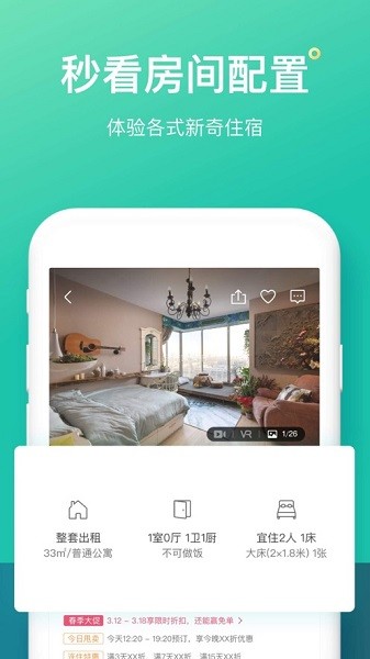 蚂蚁短租app可随时随地查看房源照片、详情介绍、房源价格,随住随订。