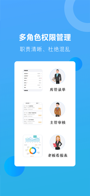 3.多角色权限操作。采购、库管、市场、财务以及老板均可在APP做账及数据查询,角色管理、角色授权、角色权限设置流程更清晰。