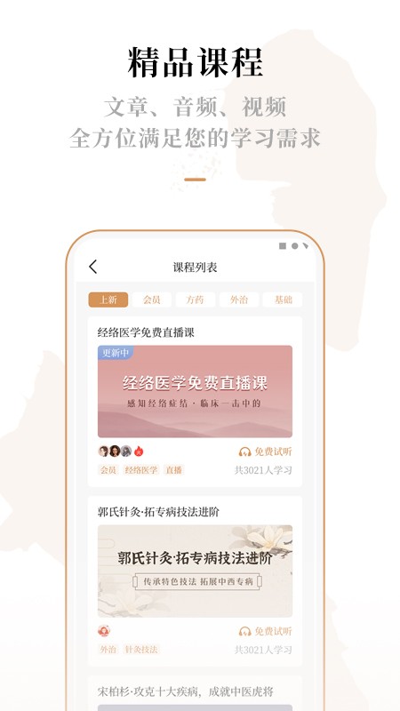 灵兰中医app最新版汇集了丰富的中医知识,用户可以在线查看相关的文章和书籍,支持在线上免费的直播课,还可以在线查资料,能进行诵读,有非常详细的学习时间以及进度记录,让用户学习起来更为方便省事。