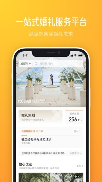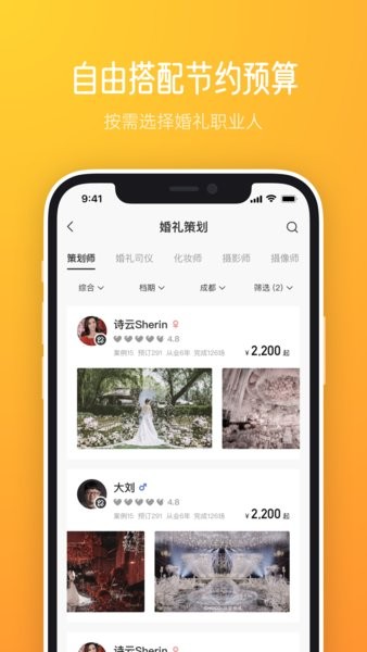 橙婚婚庆为用户带来更多优秀的婚庆服务,让用户可以在这里获得想要的婚礼,一站式的婚礼服务,海量的婚礼方案可以让用户进行选择,更加清晰的婚礼报价让用户可以自由搭配自己的预算。