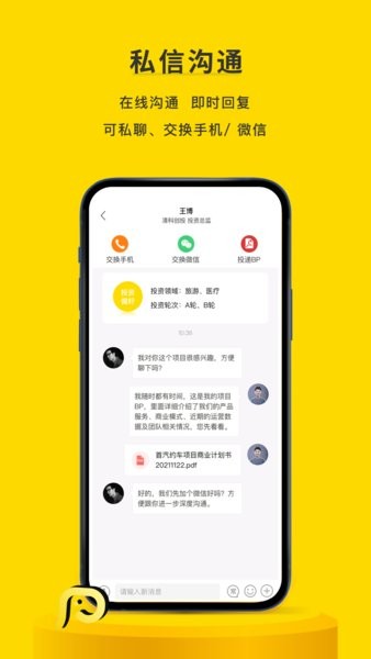 4.实时在线沟通畅聊,BP一键直接投递,切实解决投资人资源不够的融资痛点;