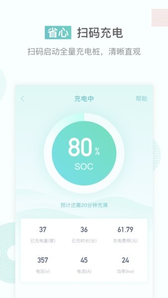 扫码充电:扫描充电终端上的二维码,一键启动充电。充电过程可实时监控充电数据,充电结束短信提醒。