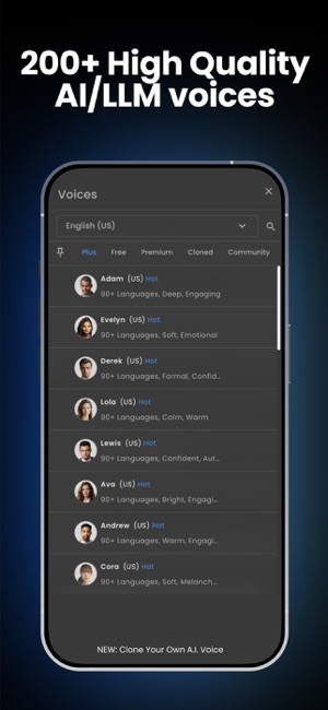 享受超过 20 种语言/方言的 130 多种人工智能语音可供选择,包括我们的 plus 语音,这是人工智能语音的最新和最高技术。plus 语音可以将流畅、听起来自然的文本转换为与人类声音的模式和语调相匹配的语音。 plus 语音可通过我们的 plus 订阅计划获得。