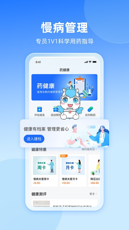 为中国数以千万计的慢病用户提供定制化的慢病管理专业方案,高效连接国内三甲医院、专家医师、大型药企、社区门店药师、慢病服务专员,帮助用户与专业健康管理团队在线联络,实现便捷的远程复诊、药品配送、档案跟踪、慢病护理、用药提醒、营养方案指导等沉浸式慢病服务体验。