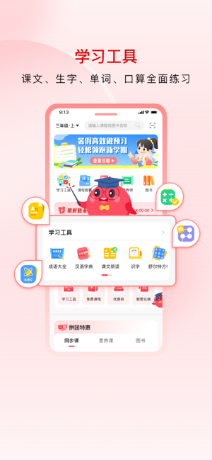 与教材课本同步,语文、数学、英语同步学习工具,通过APP进行识字、听写、单词口语、口算等专项学习。
