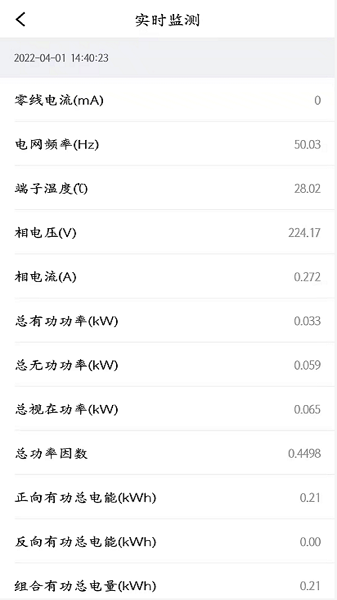 2、实时监测:支持用户查看相测量电压、相测量电流、零线电流和有用功率等微断采集的数据信息。