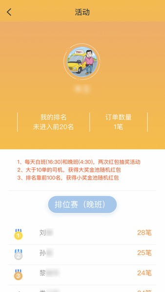 3、自动排名,根据每个司机的接单数据而自动评选了前三名;
