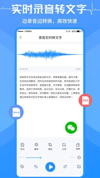 软件能满足工作生活中的语音转写、语音备忘录、文字提取、在线翻译等各种需求。