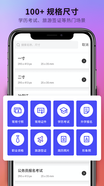 证件照换底、证件照相机、一寸照、学生证件照、工作证件照、智能证件照、证件照随手拍、结婚照、美颜证件照在家就能制作