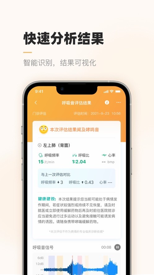 哮喘病情是否得到有效控制,与患者的自我管理非常重要。患者使用电子听诊器,每天检测肺音信息。检测完成后自动解析本次检测结果,会保留记录和追溯,以便于自我病情了解和管理,可今后病情分析的参考数据。
