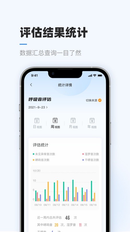 智呼吸云健康软件能够查看详细的呼吸音评估视图,可以查看当天、本周、本月以及本年度的,有非常详细的评估结果分布比例图,未见异常、干音、湿音、哮鸣音次数显示非常详细,选择听诊位置即可精准开始听诊测试和记录。