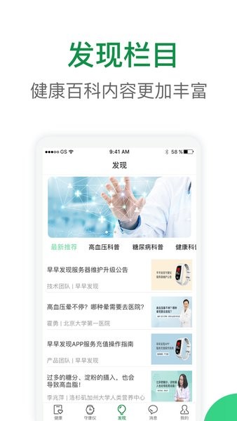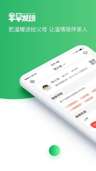 早早发现APP是由北京智康人人科技有限公司开发的一款人工智能医疗健康管理的手机应用。通过采集建立佩戴者心率、血压、血氧个人数据模型及数据动态趋势,实时分析比对心梗、脑卒中疾病模型,提示佩戴者潜在疾病风险,帮助佩戴者了解自身的身体状况。根据佩戴者身体实时状况提供951预警服务机制。提前9天App提醒用户,提前5天客服电话告知佩戴者和家属,提前24小时提供120急救服务。