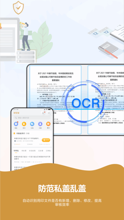 章管家最新版是提供印章监控管理服务的办公化系统软件,公章在外防私盖,采用独有一盖一码发明专利,去报每一次记录盖章文件影响、使用人、时间、地点等重要信息,自动识别用印文件,提供全生命周期印章管理,提高审核效率!
