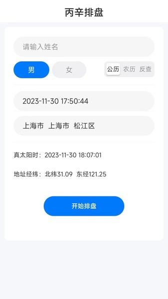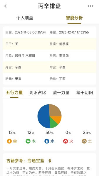 (丙辛排盘)是根据一个人的出生日期、性别等资料推算出来的一套为预测者做为参考的数据。将公历年月日时排成命盘,每个时间概念称为一柱,共有四柱;每柱有天干地支两个字,共八个字,故称四柱八字排盘。在八字命理学上,每天的时间临界点为晚上11时,而不是晚上12时。八字可以转换为“金、水、木、火、土”五行,相生相克。通过四柱干支,了解自己生辰八字中蕴含的秘密,对每个人都有着重要的参考意义。