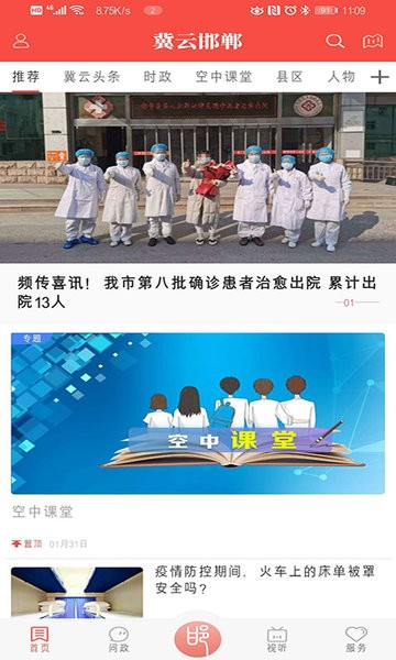 冀云邯郸客户端(空中课堂)是邯郸广播电视台打造的一款智慧城市服务平台,主要包括了新闻、政务和服务三大功能,新闻就很好理解了,邯郸本地新闻和资讯;政务,就是为了方便市民办理政务相关事情;服务,就是民生和便民相关的服务,比如邯郸天气、公交查询、预约挂号等。