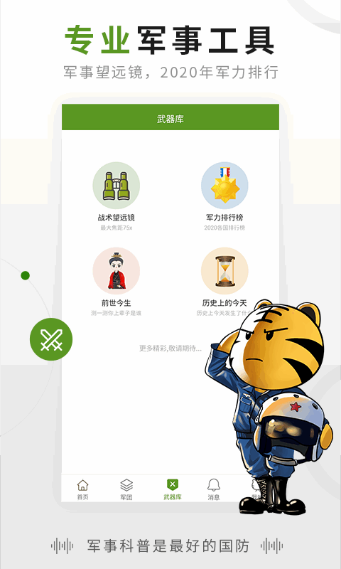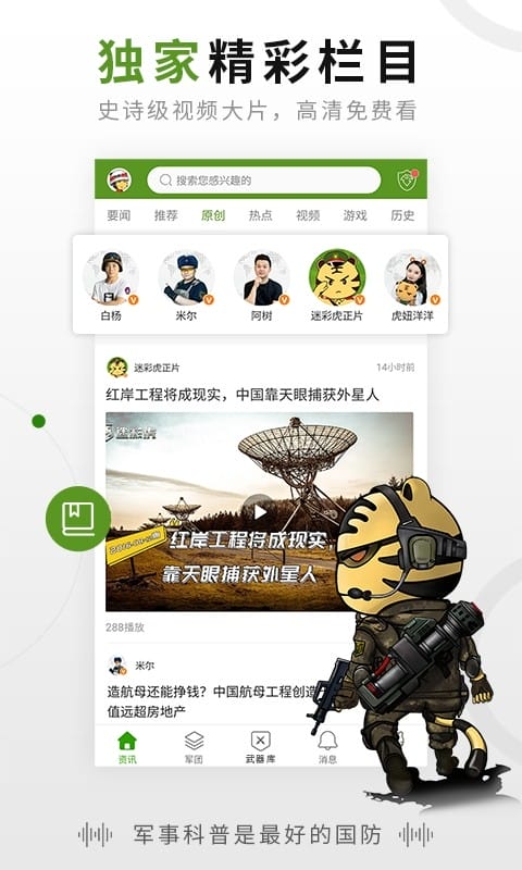 迷彩虎军事最新版是提供军事国防科普类的应用软件,聚焦军事国防头条热点新闻,提供独家精彩栏目,高清视频大片随你观看,还有专业的军事工具可以了解学习,支持在线收藏评论,结识跟多志趣相投的伙伴,更可以模拟参军体验,给人不错的享受!