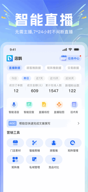 店鹊系统是针对实体经营商家提供智能ai直播营销的助手app,让你的直播降本增效,智能营销,快速获得曝光,提供丰富直播素材,支持ai创作,轻松剪辑,让直播更丰富,更具有吸引力,操作简单易上手,省时又省心,提高效率,值得推荐!