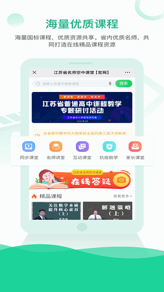 江苏省名师空中课堂在线教学是江苏本地的在线移动课堂教学平台,打造掌上课堂环境,提供优质课程资源,专业名师在线直播授课,互动答疑解析,海量题库自动刷新练习,还提供错题高效管理,实现资源共享,加强家校联系,十分方便!