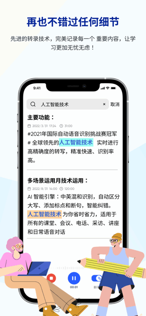 适用于所有的课堂、会议、电话、采访、讲座和日常语音对话,人工智能为你省时省力。