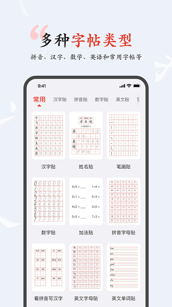 汉字贴、姓名字帖、笔顺贴、笔画贴、控笔贴、偏旁贴、文章贴、拼音笔顺贴等