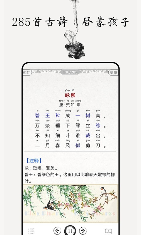 5、支持对照朗诵、逐句跟读、文本默写功能,对孩子学习国学诗词有帮助。