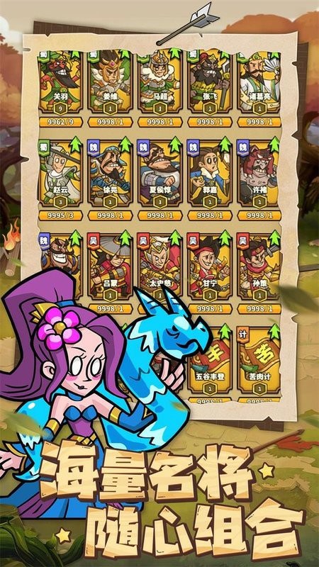 1、诙谐的武将和有趣的三国人物羁绊,可搭配出百种策略组合,打造超神阵容!