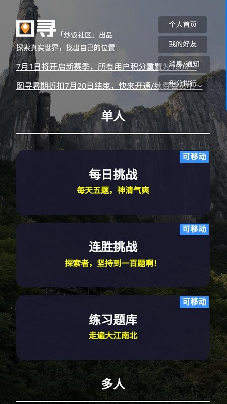 图寻最新版是有趣又好玩的地理挑战工具,拥有简约的界面,丰富的玩法内容,不同的游戏模式,提供每日挑战、连胜挑战、练习题库、多人挑战等随你选择体验,不断刷新排名,边玩边学,掌握更多知识,提升能力,带来不错的使用体验!