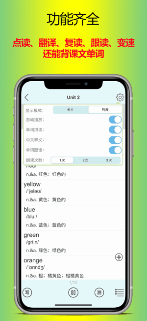 -- 功能齐全,点读、翻译、复读、跟读、变速,还能背课文单词