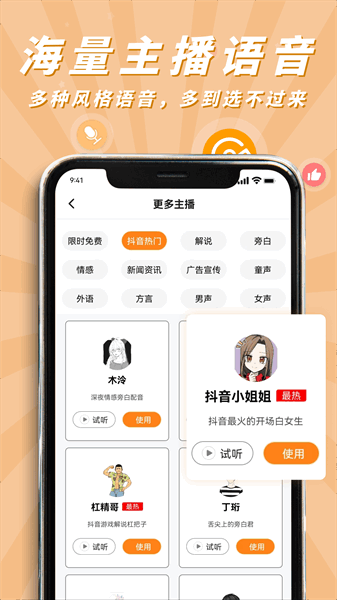 2、有强大的语音技术,优质的配音效果,并且提供海量配音模板、各种特色的发音人主播。