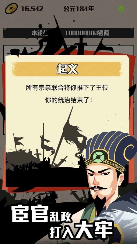 在我们进入游戏的时候,要注意在某势力达到20时,将会出现推翻,结束游戏,在某势力达到14以上时,请注意,减少这势力,以防推翻政权,还有就是某势力达到三以下也会出现反叛,可用钱镇压,也可直接镇压,建议用钱镇压,请注意平衡。