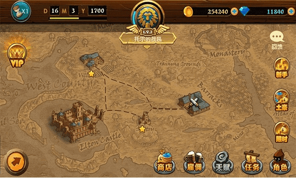 最后,天赋系统是游戏中最需要我们研究的地方,因为它直接关系到了你在游戏中的战略方向与兵力的强弱。天赋分为“主城天赋”与“角色天赋”两大类,前者关系到你的领地税收、任务的解锁、获得高品质英雄的几率等,后者则是针对角色的战斗属性提升,如暴击率、穿刺、魔法攻击、攻击距离等。而“天赋树”又有很多分支,打通天赋需要消耗很多的游戏币与宝石,所以玩家需要合理的规划好自己的发展方向。