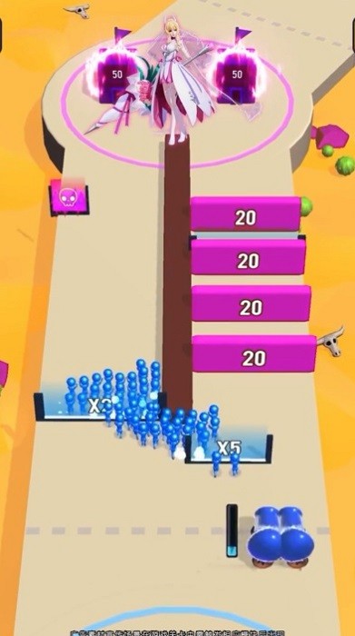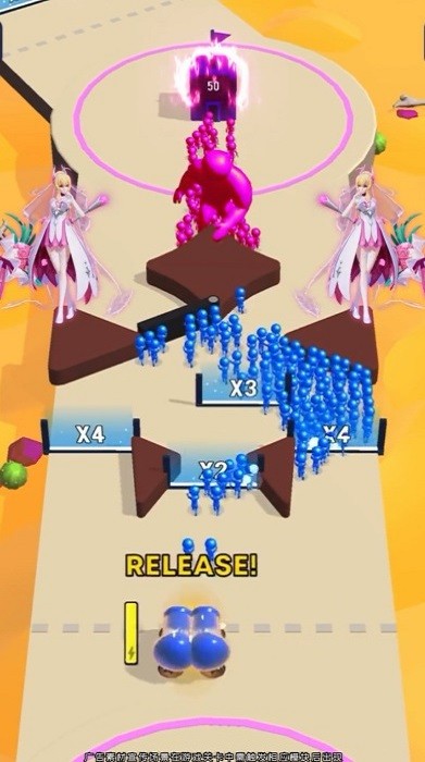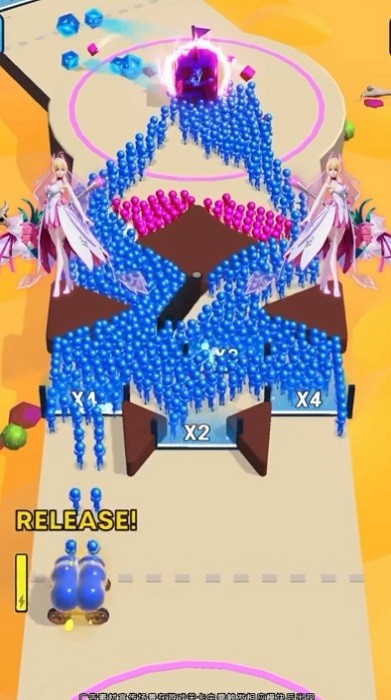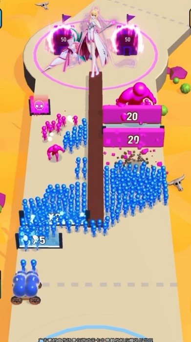 关卡开启后,玩家可以控制炮台发射小人,通过控制炮台发射方向,可以控制小人的行进路线,经过地图上的加倍区域后,小人就会直接增加到对应倍数,比如10个小人经过3倍区,此时小人就会变成30个,小人会越来越多,当炮台能量积攒满后,还可以出现大黄人,拥有更强的战斗力。