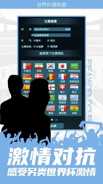 模拟2022年卡塔尔足球世界杯比赛结果,用户可以自主选择想要进行模拟对战的队伍,并且可以选比赛进行时间,球场和当天的天气情况!