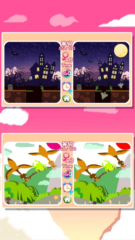 通过在两个差不多一样的图片上找出它们之间不同的五处地方,并且根据用时长短来打分,最终闯关并获得1~3颗小星星。这可以锻炼男生和女生的耐心认真的好习惯。