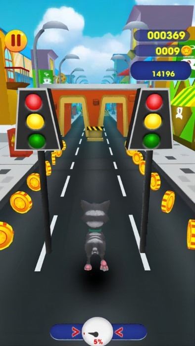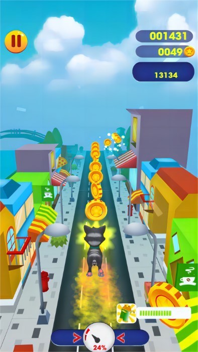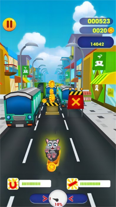 3、控制猫猫跑酷躲避保安的追逐,收集金币,合理利用道具,争取拿到最高分