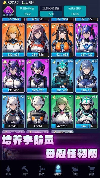 4、记得及时返回母舰补充补给和修理,避免长时间处于危险之中,资源管理、技术选型、宇航员培训、策略决定了发展速度,且易于操作。