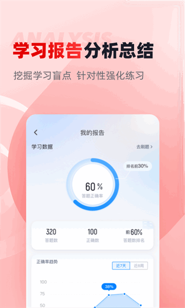 4、学习报告,将会在线对用户提供专业学习报告功能,能对每一次学习成果等进行统计。