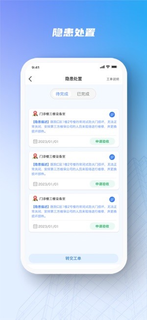 线上提交各种安全隐患处置验收信息的方式帮助用户极速完成申请验收流程;