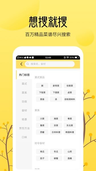 烹饪美食大全是教大家做菜的软件,可以对每日饮食合理的规划,菜谱分类十分的齐全,支持名称搜索菜品,点击即可查看详细的做法,使用起来非常的方便。