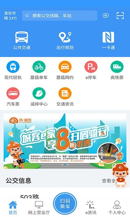 淮安城客e家app不仅提供了公交车出行服务,同样还支持网约车、单车、电车等可以在线查询公交的到站信息,可以查看详细的车辆位置,可以进行换乘线路的规划查询,支持用手机扫码骑单车,出行更便捷高效!
