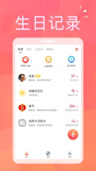 生日、纪念日、倒数日、节日多种类型,支持公历农历,标签分组,生日记录置顶,更方便的管理。